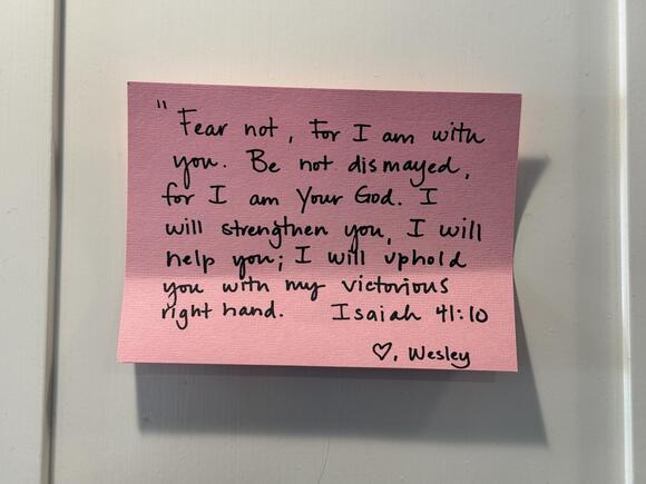 Just above their oven, one of the notes quotes scripture, “Fear not. I am with you. Be not dismayed.”